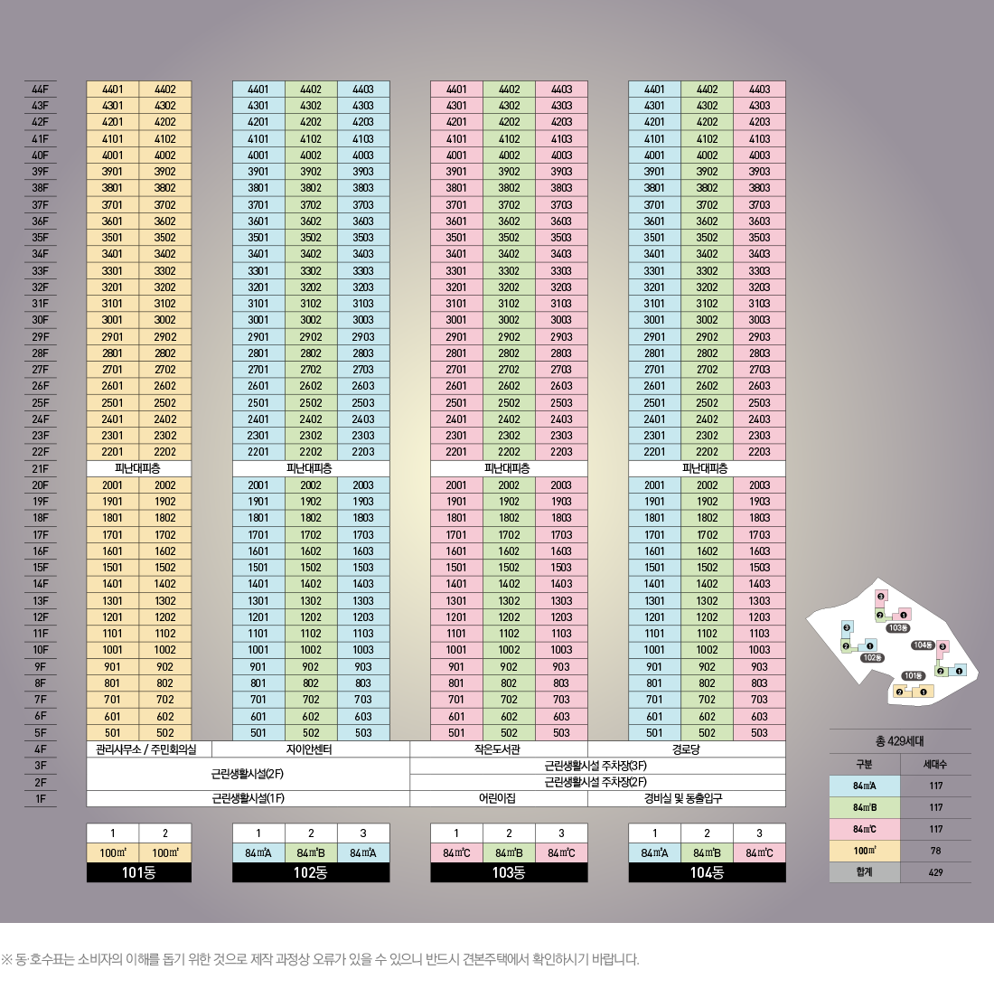 | 세대수(4개동) | 총(429세대) 84A 117세대, 84B 117세대, 84C 117세대, 100 78세대 |
